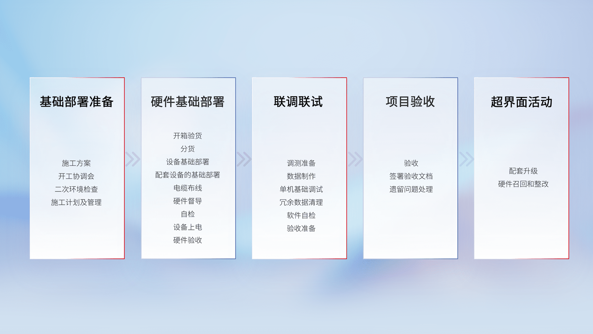 从基础部署准备、、、、硬件基础部署、、、联调联试、、、项目验收、、越界面活动的全过程可追溯,,保证施工质量和进度。。
